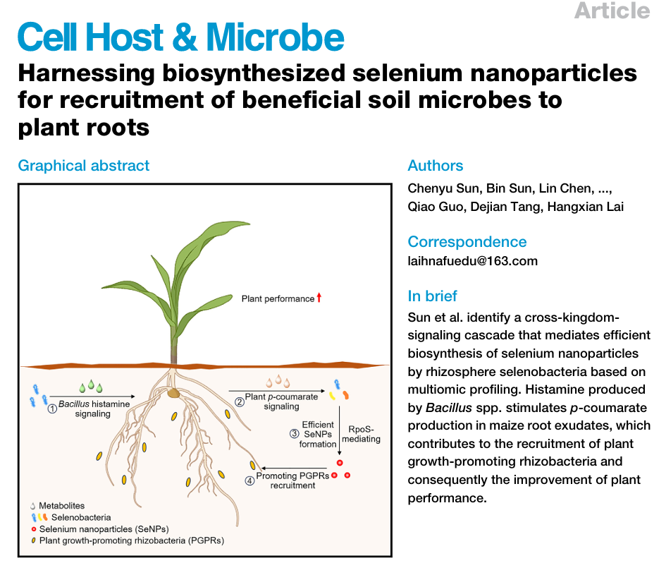 近日,来航线教授团队在植物-微生物互作方向取得新的进展,研究成果以“Harnessing biosynthesized selenium nanoparticles for recruitment of beneficial soil microbes to plant roots”为题在Cell子刊《Cell Host & Microbe》(IF2023 = 30.3)上发表。yl23455永利官网博士研究生孙晨瑜、硕士研究生孙斌和西北大学青年教师陈林为共同第一作者,来航线教授为通讯作者,yl23455永利官网为第一和通讯单位。