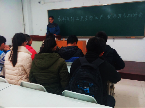 1月12日上午,响应校党委和学院党委要求,我院本科生环工党支部在支部书记蔺悦主持下开展了“三严三实”学习与自我批评会,支部指导老师和红燕参会,带领支部党员认真学习了“三严三实”的精神。