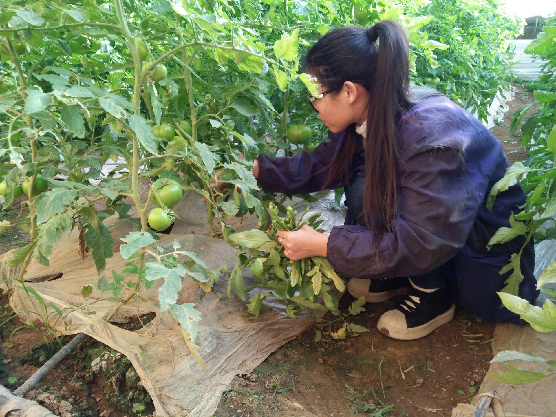 两个多小时的时间,队员们除枝速度从慢至快,动作愈发娴熟。此时汗水出现在额头也浸湿了衣物,然这泯灭不了志愿者们劳动的热情。在这个过程中,志愿者们学习到了西红柿的除枝技巧。最后,队员们协力把修剪后的枝叶清理出去,以免产生病菌。