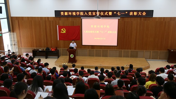 奏唱国歌后,全体到会的预备党员和正式党员起立,在学院研究生辅导员赵倩茹同志的领誓下,面向党旗,庄严宣誓:“我志愿加入中国共产党,拥护党的纲领,遵守党的章程……”,洪亮激昂的宣誓声响彻资环报告厅。之后,学院党委副书记田长河宣读了对学院先进党支部、优秀共产党员和优秀党务工作者的表彰决定,公布了“课程思政”教学改革竞赛的获奖教师名单。与会嘉宾和学院领导分别上台向教工水保党支部等6个先进党支部、孙本华等9名优秀教工党员、张世君等23名优秀学生党员、王九军等14名优秀党务工作者、佟小刚等12名“课程思政”竞赛获奖教师颁发了荣誉证书并合影留念。