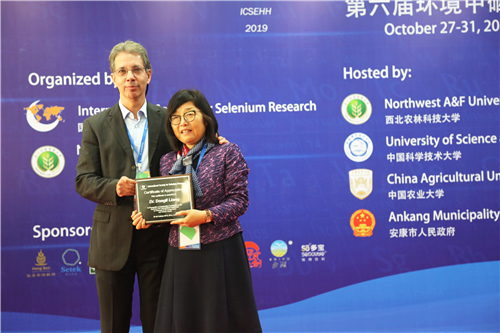 国际硒研究学会主席Gary Bañuelos为yl23455永利官网梁东丽教授颁发杰出贡献奖