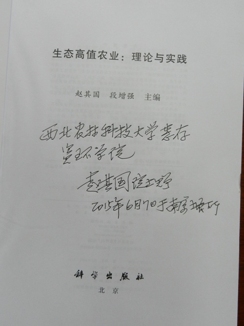 赵院士向吕家珑院长赠送了附有他题字的著作《生态高值农业:理论与实践》。并请吕家珑院长转交他给孙其信校长的亲笔信。