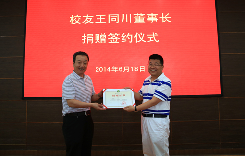 常务副校长赵忠向王同川校友颁发捐赠证书